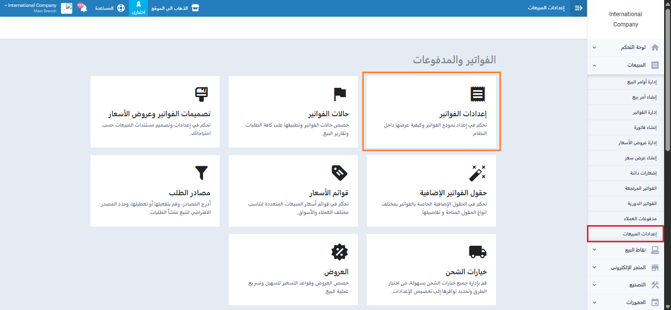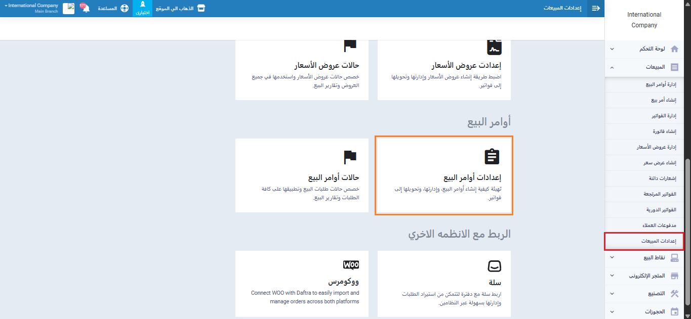 من القائمة الرئيسية اضغط على “إعدادات المبيعات” من القائمة المنسدلة عن “المبيعات“.