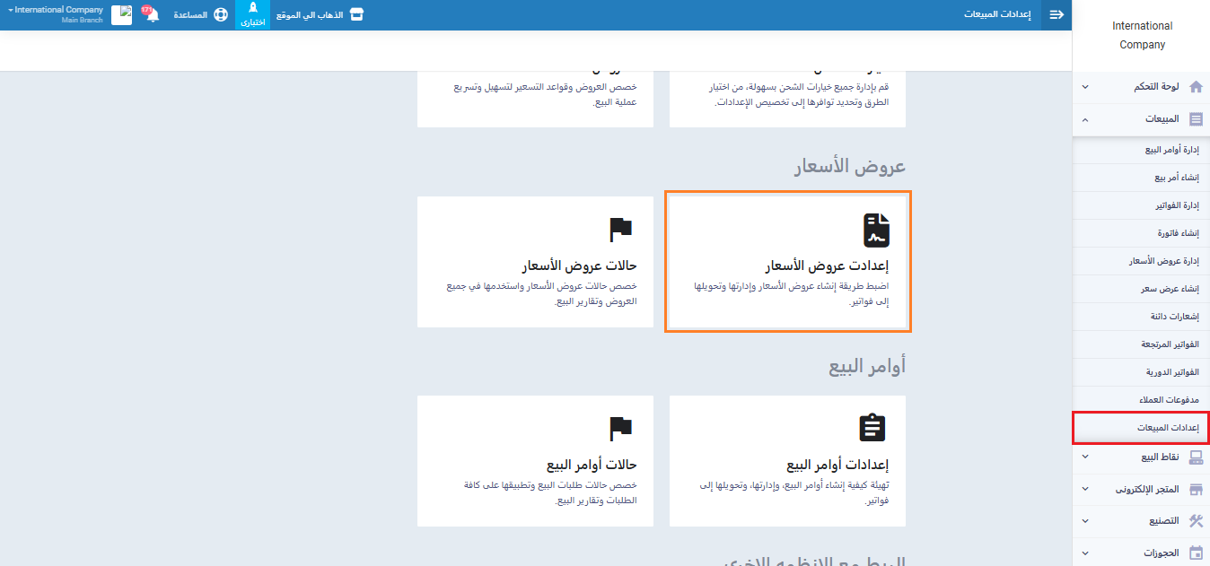 من القائمة الرئيسية اضغط على “المبيعات“, ثم “إعدادات المبيعات“. توجه الى “إعدادات عروض السعر“.