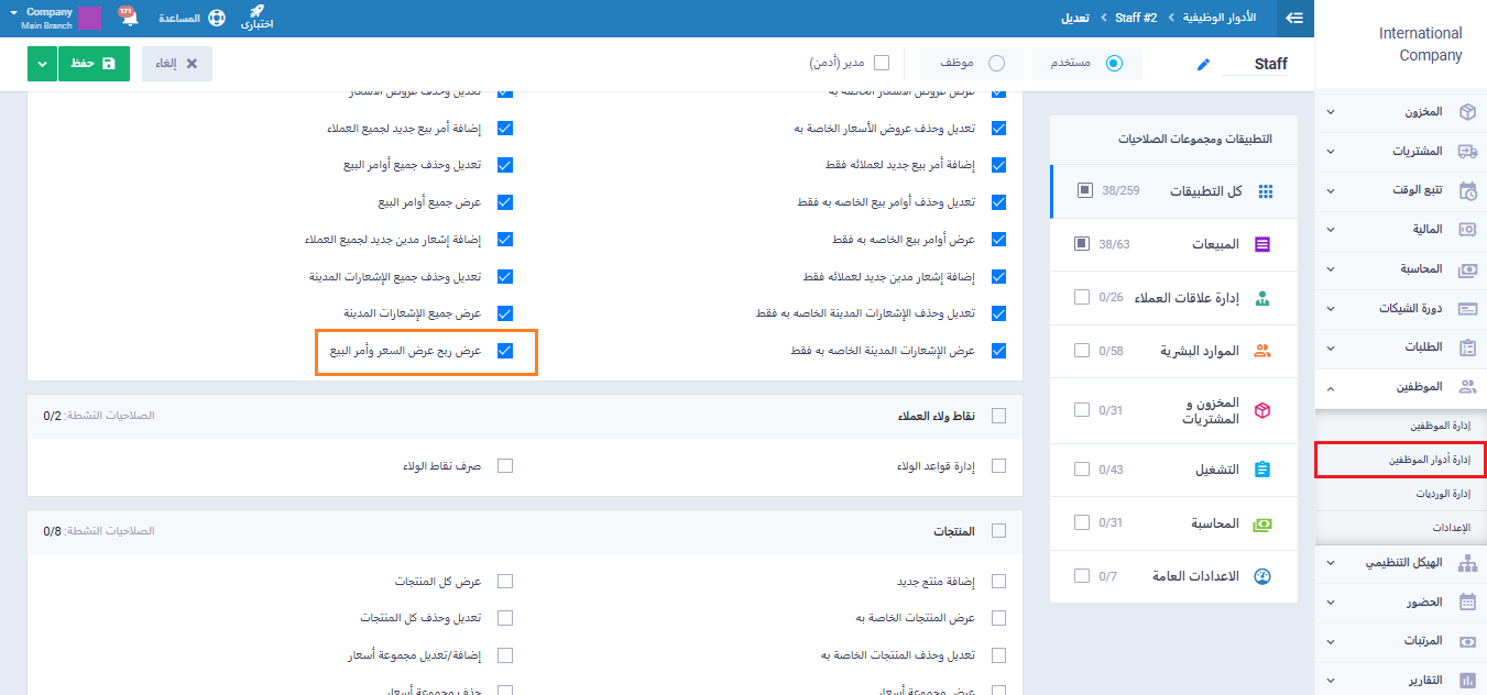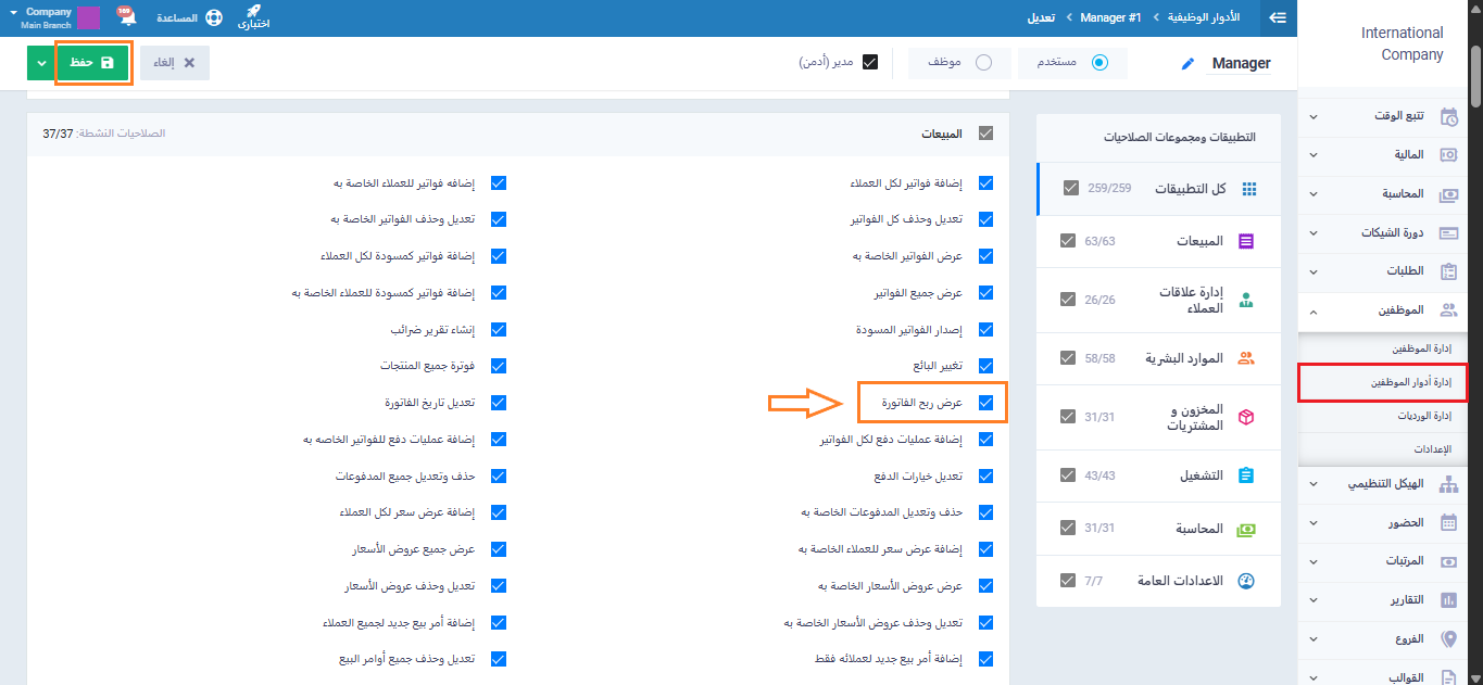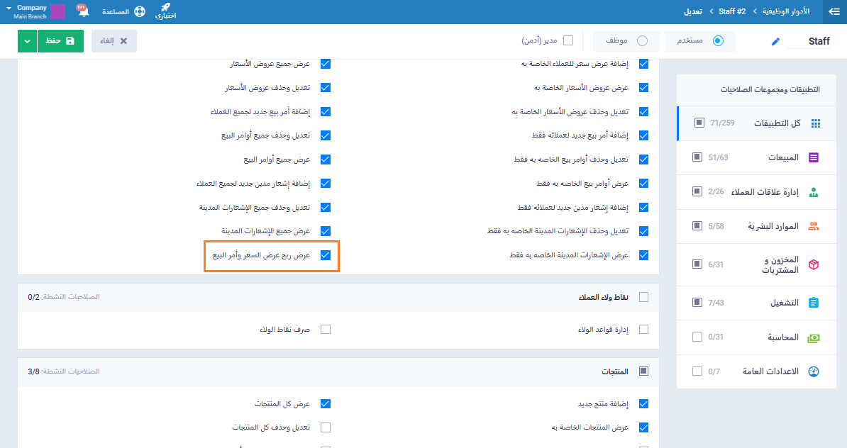 وتأكد ايضا من إعطاء الموظف الصلاحية ليظهر له ربح أمر البيع من داخر “إدارة أدوار الموظفين“.