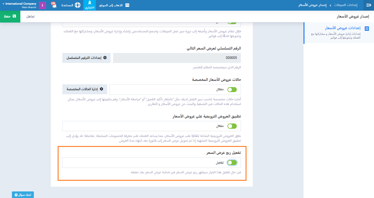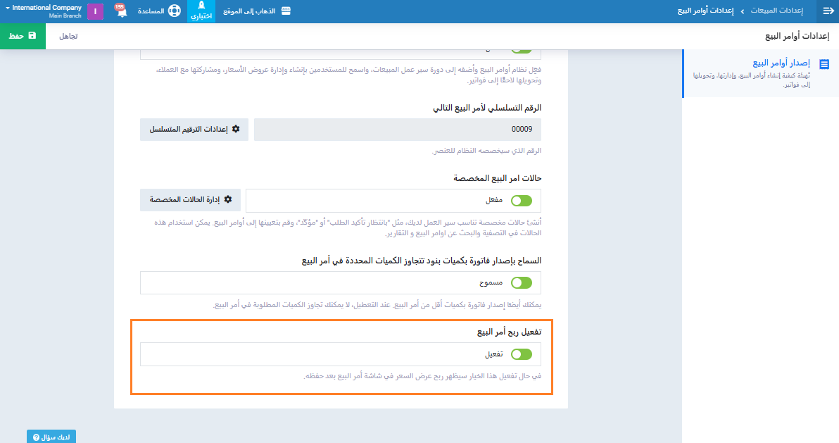 فعل تطبيق “حساب هامش ربح الفواتير وعروض الأسعار“.
