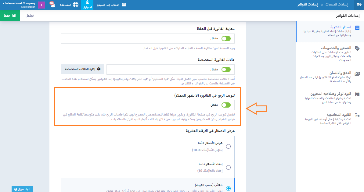 قم بتفعيل الإعداد “تبويب الربح في الفاتورة“.