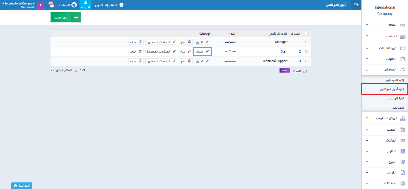 توجه الى “إدارة ادوار الموظفين” من القائمة المنسدلة من “الموظفين“. اختر الدور الوظيفي المطلوب ثم اضغط على زر “تعديل“.