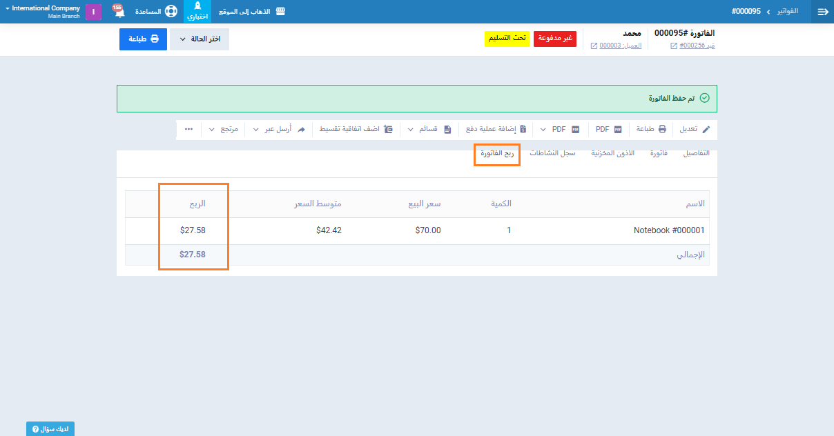 بعد حفظ الفاتورة، يظهر في الجزء العلوي منها تبويب “ربح الفاتورة”، والذي يوفّر لك عرضًا واضحًا لهوامش الربح الخاصة بهذه الفاتورة.