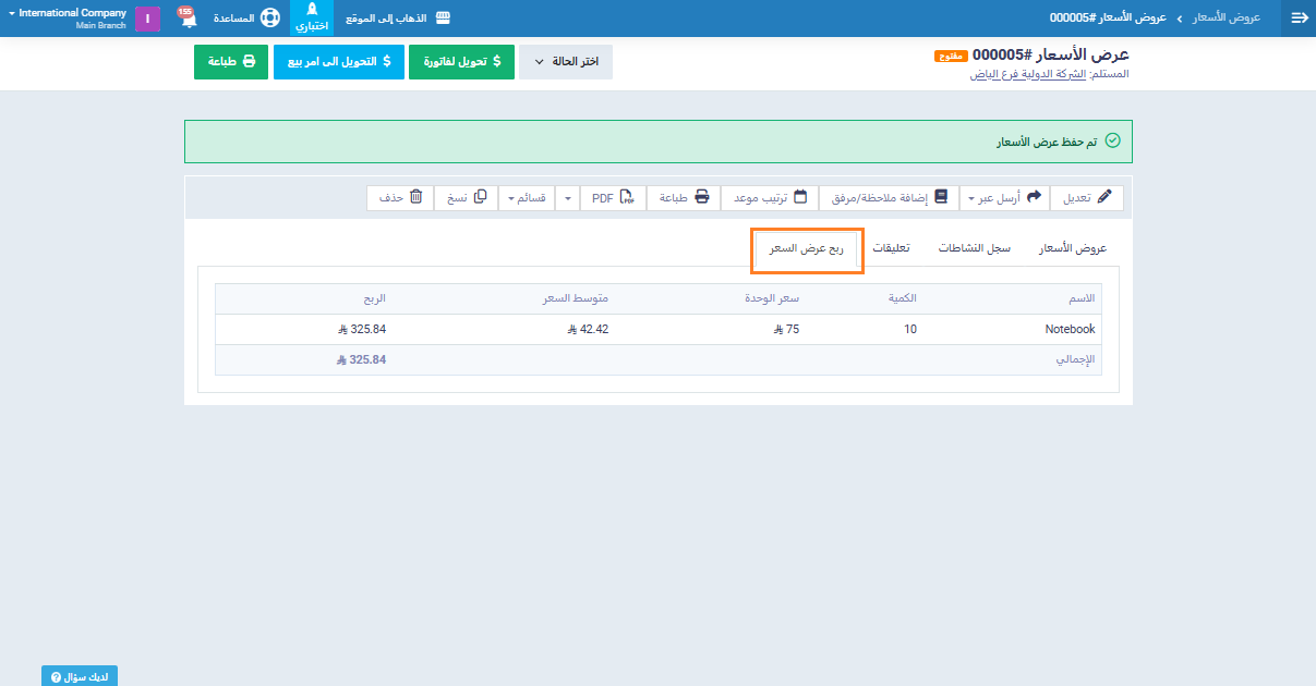 اضغط على تبويب “ربح عرض السعر” الموجود أعلى شاشة عرض السعر، للاطلاع على تفاصيل هامش الربح المرتبط بهذا المستند.