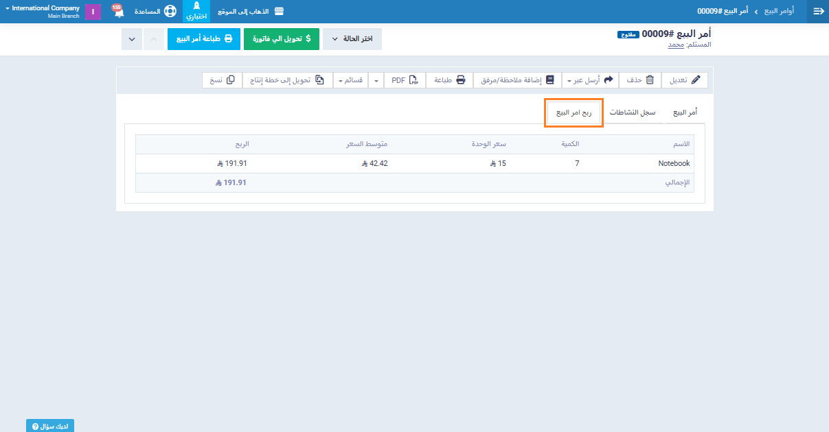 اضغط على تبويب “ربح أمر البيع” الموجود أعلى شاشة أمر البيع، لعرض تفاصيل هامش الربح الخاصة بهذا المستند.
