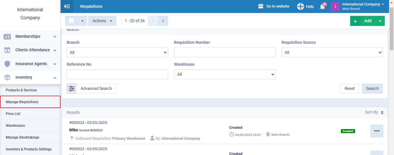 - The system displays a list of “Warehouse Requisitions” created in the account: