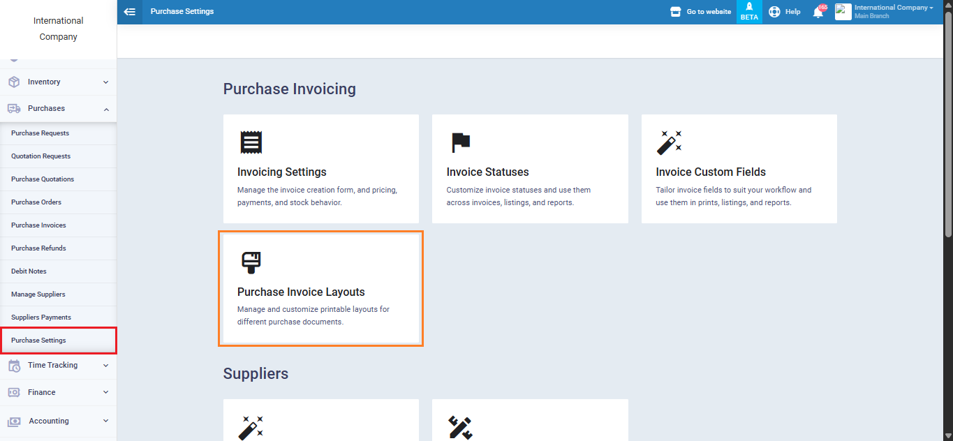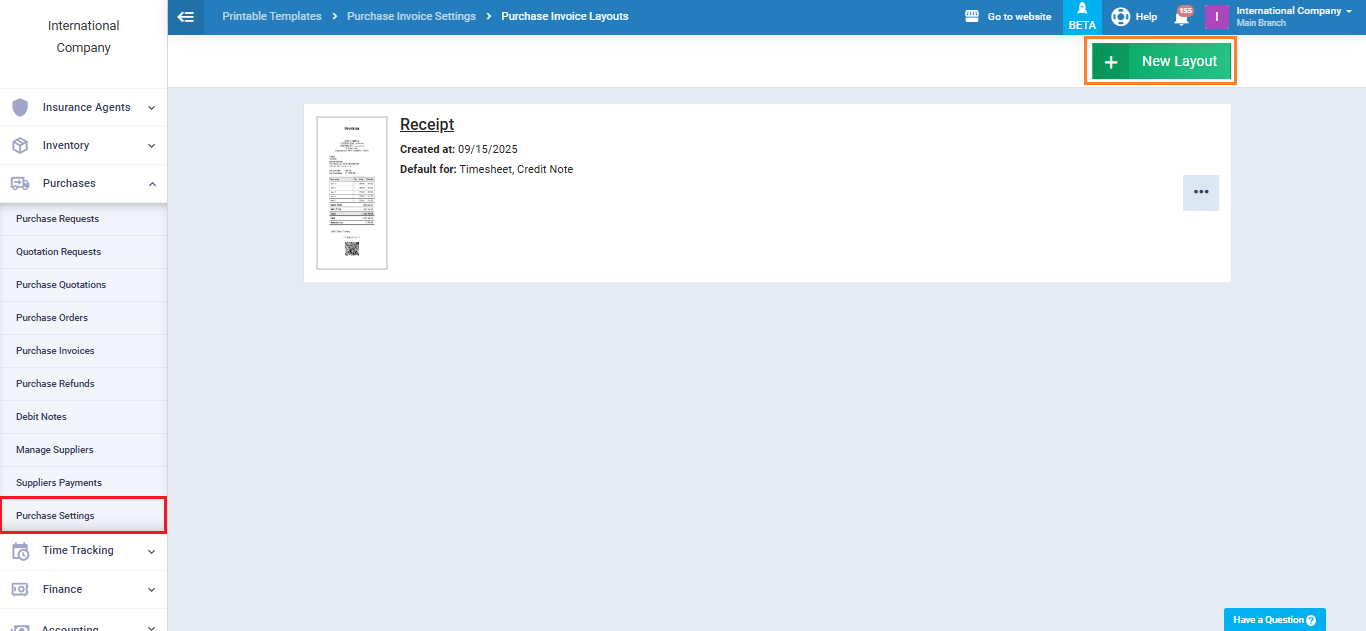 Click on ‘Purchase Invoice Settings‘ under ‘Purchases‘ in the main menu, and click on ‘Purchase Layouts.'”