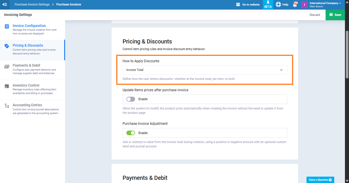 To apply a discount to the total purchase invoice, click on “Purchase Settings” under “Purchases” in the main menu and then on “Invoicing Settings.”