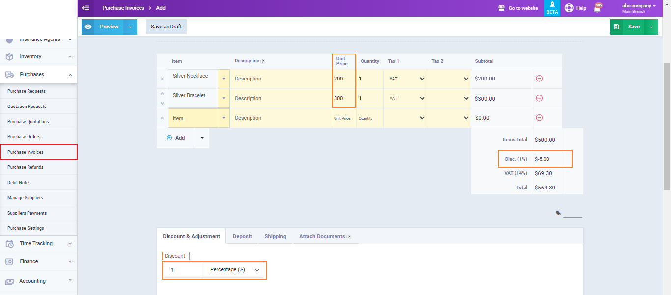 The system allows you to add a discount either at the invoice level as a whole or at the item level only within a purchase invoice. This is explained in detail below.
