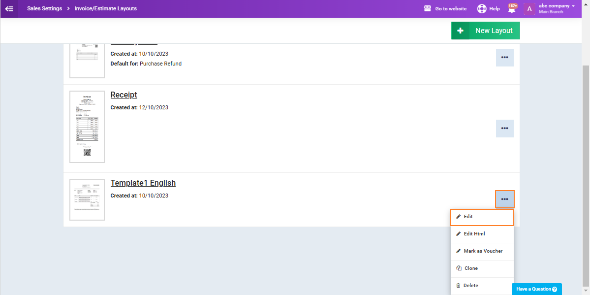 Click on the three dots next to the layout you want to add the QR Code to, then click on ‘Edit‘ from the dropdown menu.