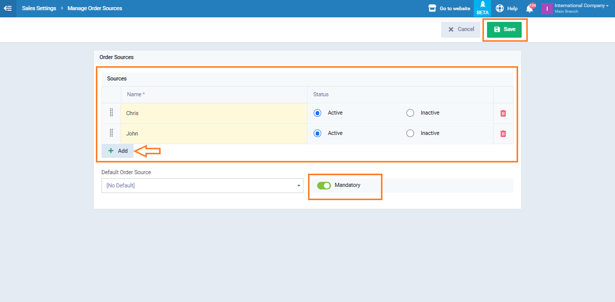 From there, you can add the names of the sales representatives you want to link to invoices. If you want to ensure that no invoice can be saved without selecting an order source (i.e., the representative), enable the “Mandatory” option to make it a required field before saving invoices.