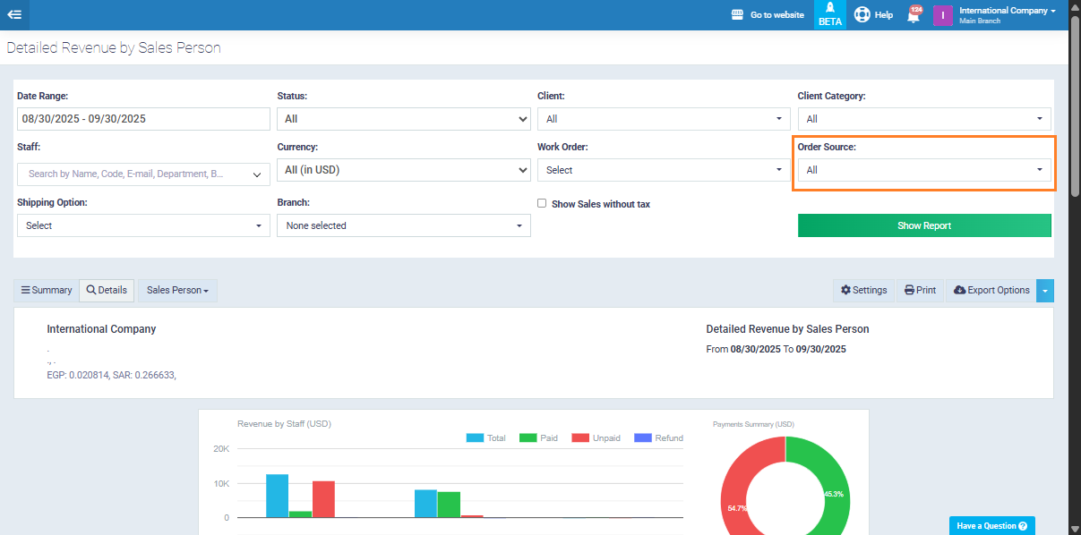The system allows you to add the sales representative to the invoice through the Order Sources feature. This way, every sales transaction can be linked to the representative responsible for it, and you can then extract customized reports to review each representative’s sales separately.