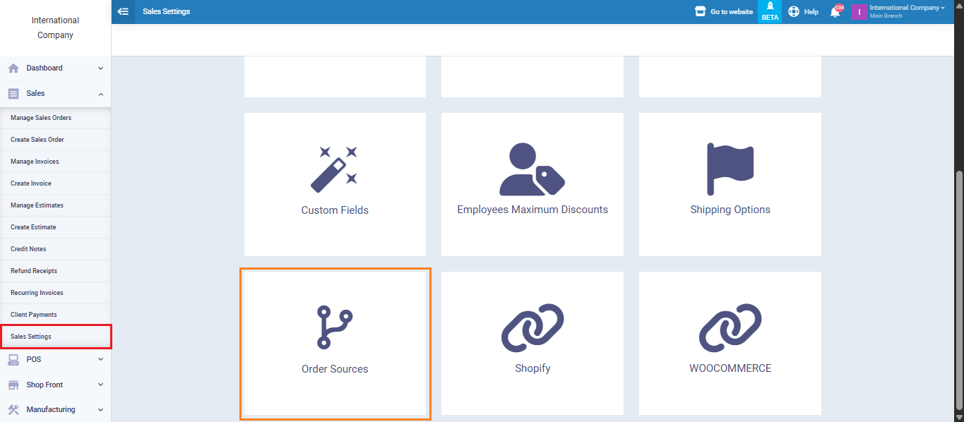 Go to the “Sales” menu, then select “Sales Settings” and open the “Order Sources” section.
