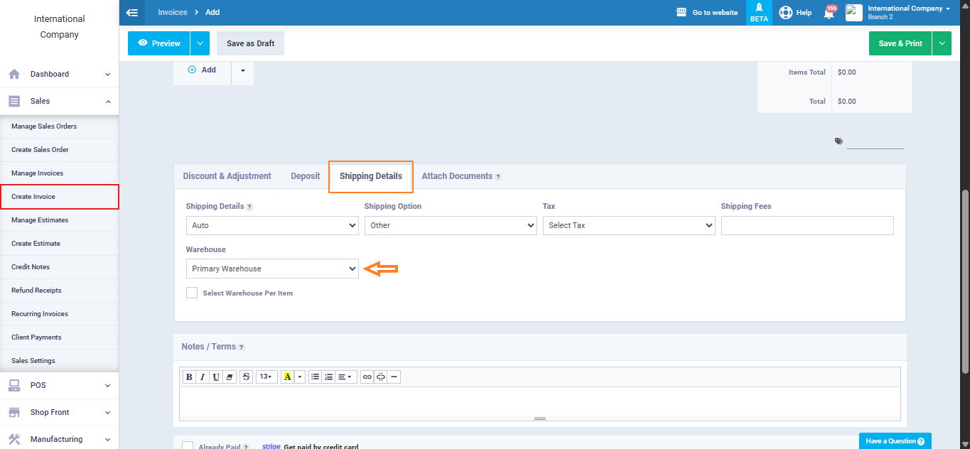 You can assign one primary warehouse in the system, and the primary warehouse appears as a default warehouse when conducting any transaction unless you replace it with another sub-warehouse.
