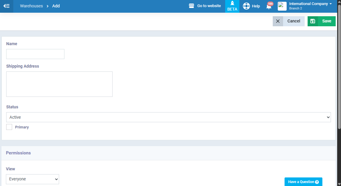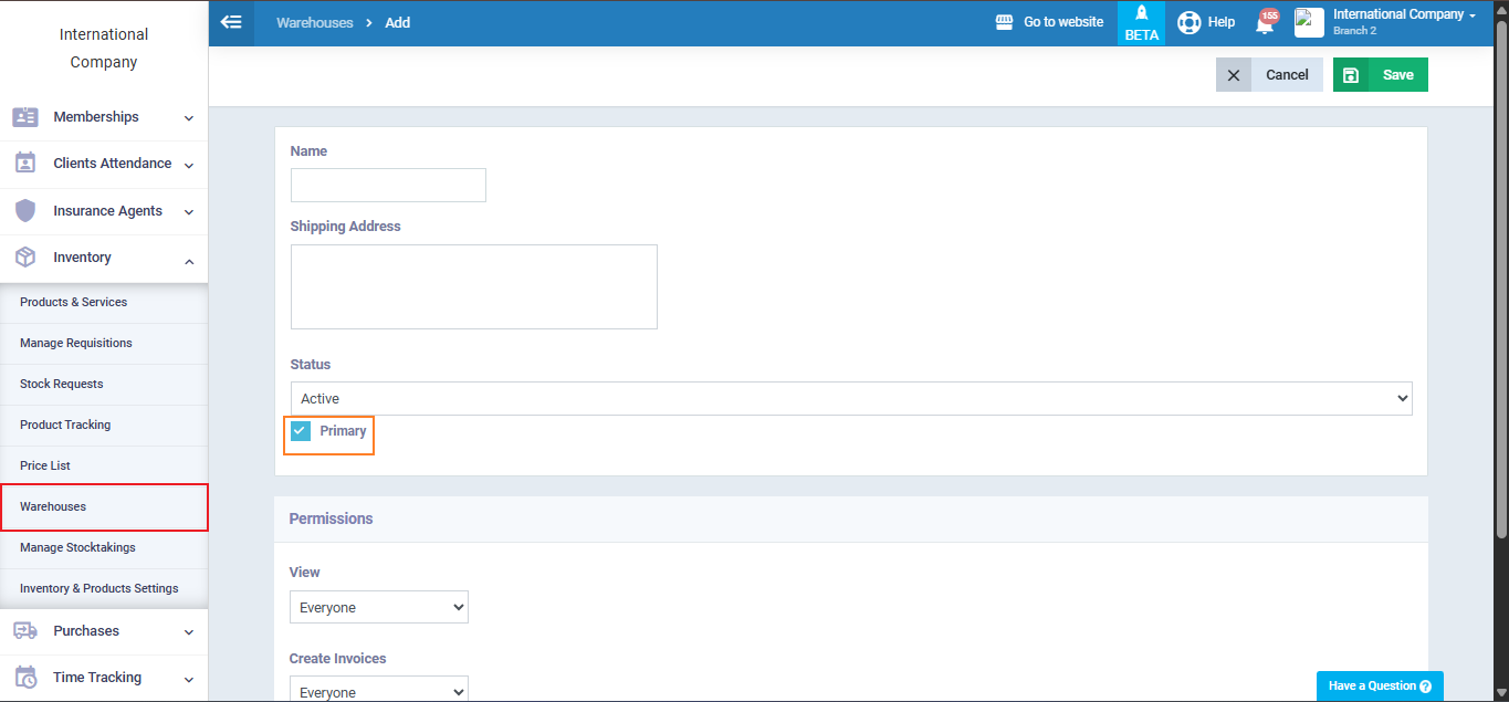 To assign a warehouse as the primary one, click on the “Warehouses” dropdown from the “Inventory” in the main menu, click on the “New Warehouse” button or choose an old warehouse and click on the “Edit” button, then activate the “Primary” checkbox ☑️ on its data screen, and click the “Save” button.