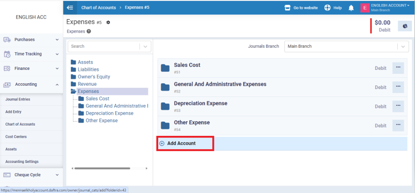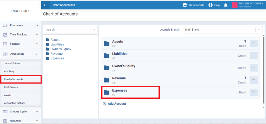 From the main menu, go to “Accounting”, then select “Chart of Accounts”, and go to the “Expenses” section.