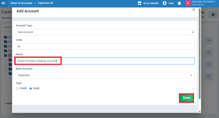 Create a new account named Asset Purchase Clearing Account, which will be used later for recording the invoice and linking it to the asset. Click “Save”.