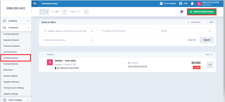 Go to the “Purchases” menu, then click on “Purchase Invoices”.