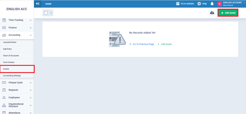 Finally, from “Accounting” in the main menu, go to the “Assets” section and click on “Add Asset”.