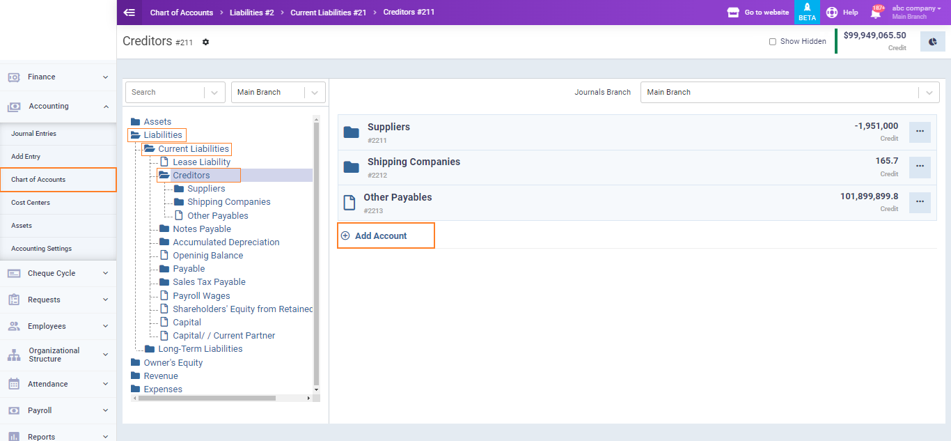 Click on “Chart of Accounts” from the “Accounting” dropdown menu in the main menu, then click on “Liabilities,” then “Current Liabilities,” then “Creditors,” and click on “Add Account“.
