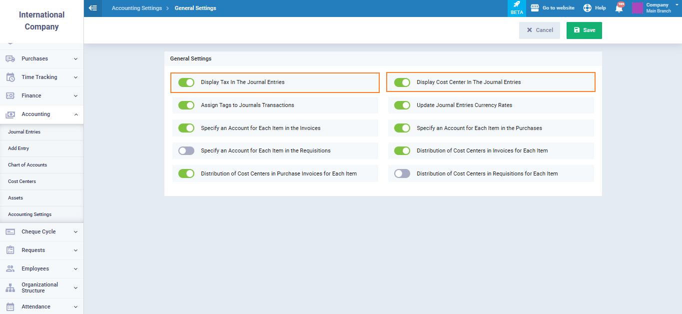 - Activate the “Display Cost Center In The Journal Entries” option to be able to assign cost centers to journal entries during the addition process. Then click the “Save” button.