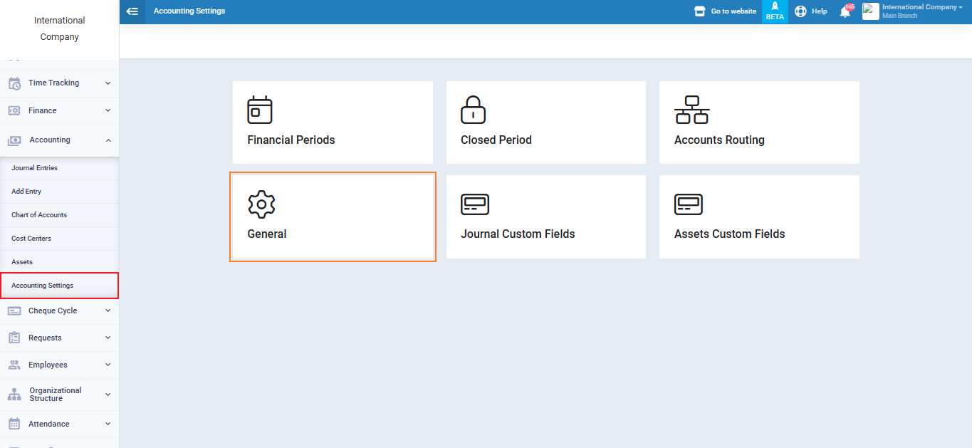 Click on “Accounting Settings” from the “Accounting” dropdown menu in the main menu, then select “General“.