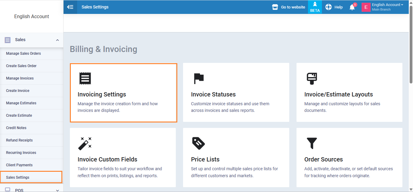 From the main menu, go to “Sales”, then select “Manage Invoices” from the dropdown menu.