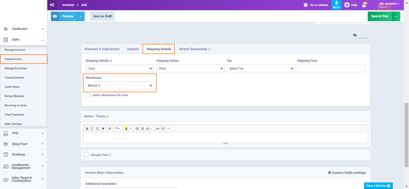 When creating an invoice in this same branch, you will find that in “Shipping Details,” the default warehouse is the one assigned as the default for this branch. In this example, “Branch 2” is shown as the default.