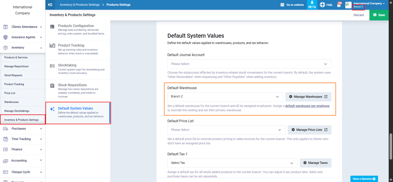 Through inventory settings in the system, you can assign a default warehouse for each branch, which will be shown as the default option when selecting a warehouse in branch invoices or any of its accounting transactions.