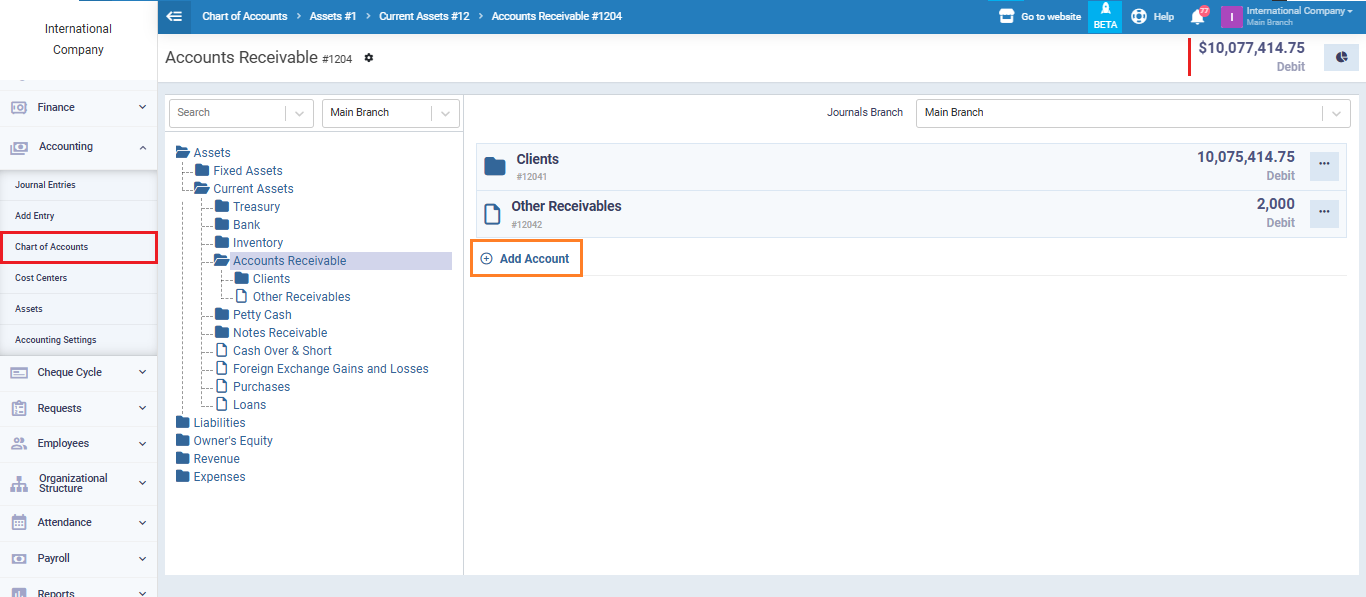 The system allows you to link each client to a specific main account within the chart of accounts. This ensures accurate accounting allocation and organized financial management.