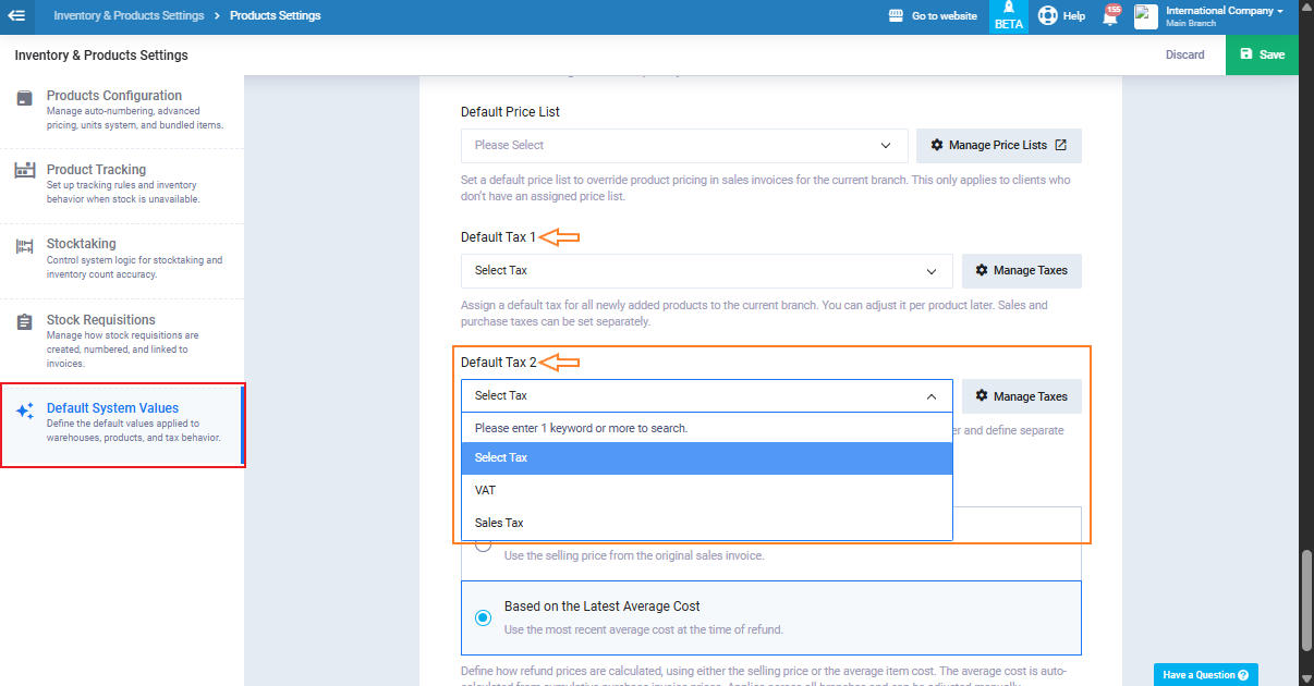 From the section “Default System Values” you’ll find the fields “Default Tax 1” or “Default Tax 2“, select from the dropdown menu the tax name you want to set as default.