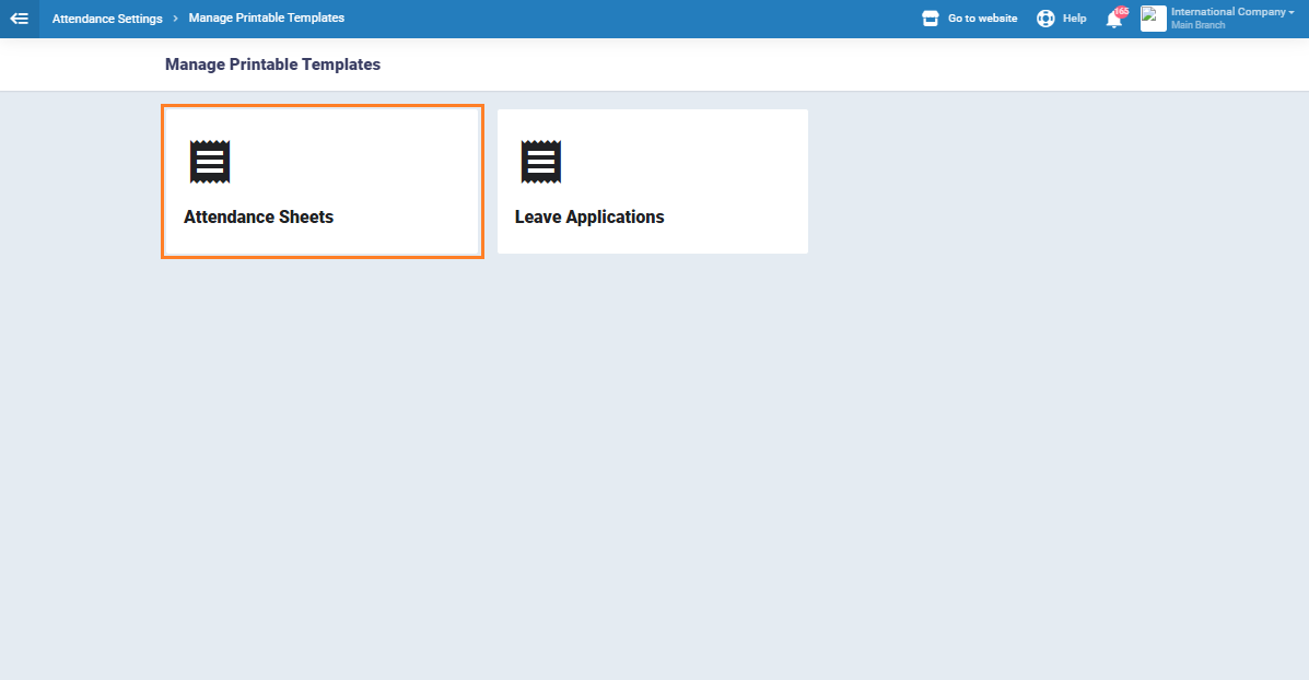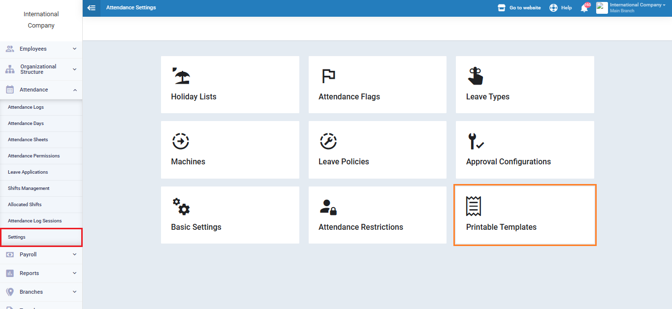 Click on “Settings” from the dropdown menu of “Attendance” on the main menu, then click on “Printable Templates“.