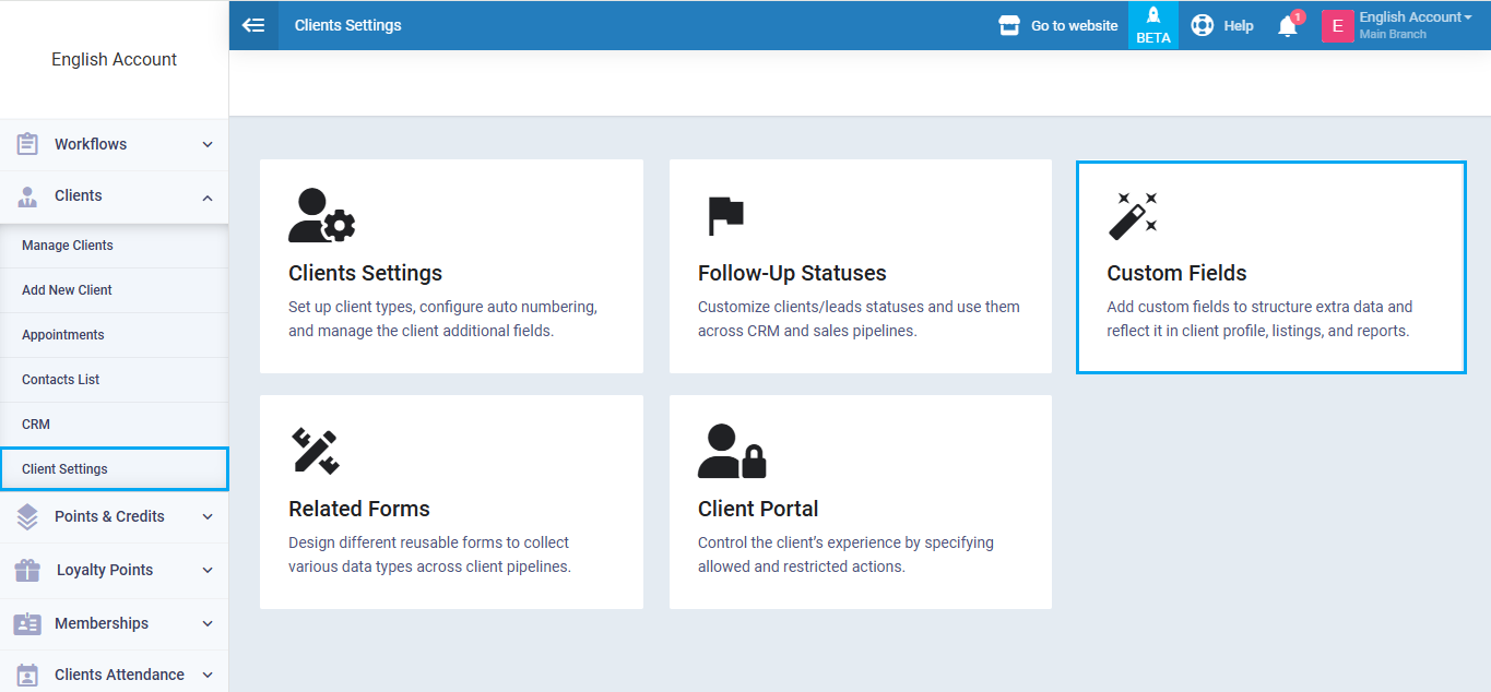 However, if you want to add a field to client profiles, you can head to “Client Settings” found in the dropdown under “Clients” in the main menu. Then click on “Custom Fields”.