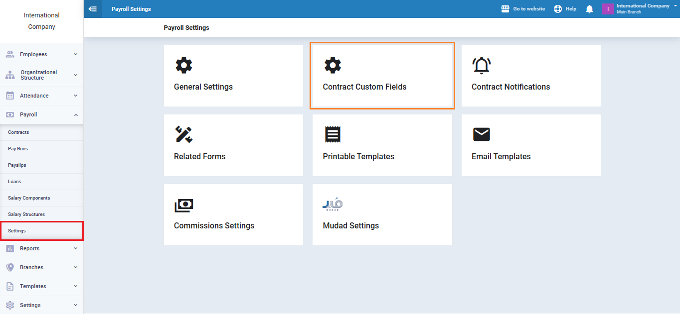 However, if you want to add a field, you can head to “Settings” dropdown under “Payroll” in the main menu. Then click on “Contract Custom Fields”.