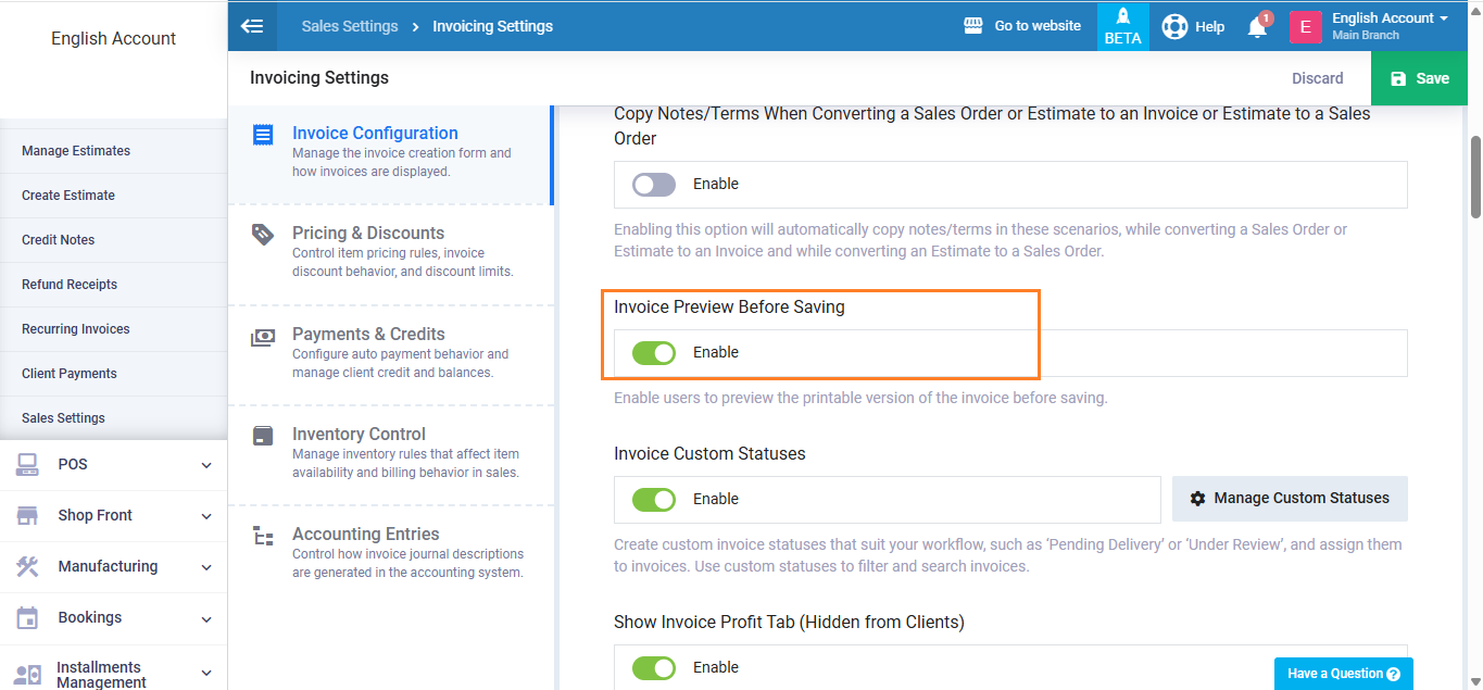 Make sure to activate the setting “Invoice Preview Before Saving” then click the “Save” button.