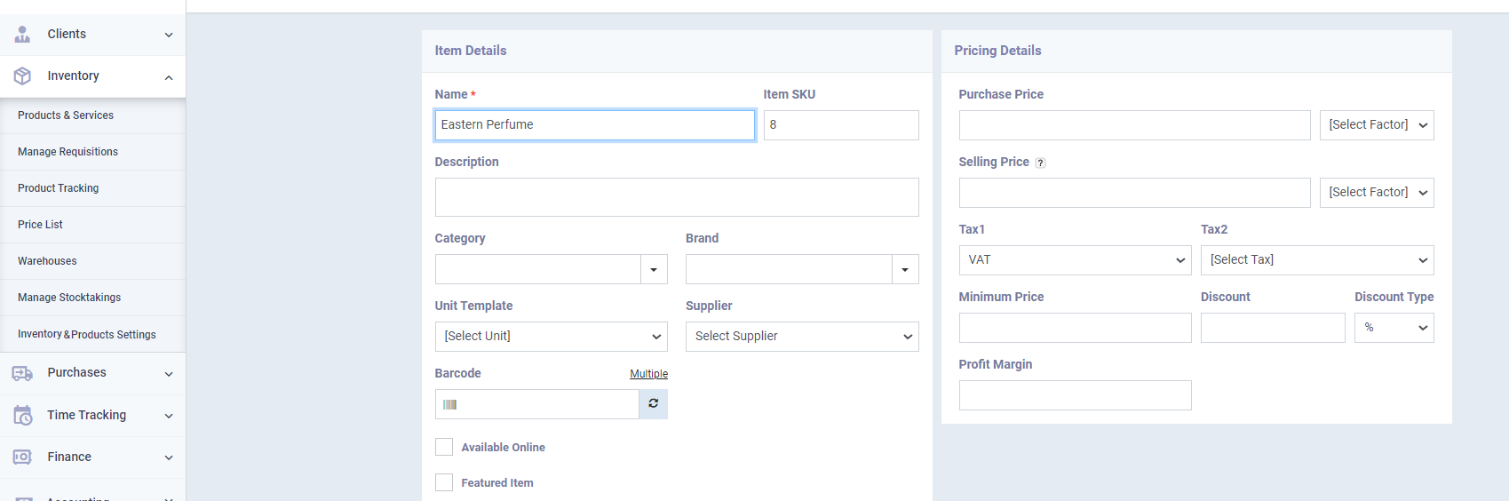 Enter the item details and the usual pricing details as is the case when adding a new product or service