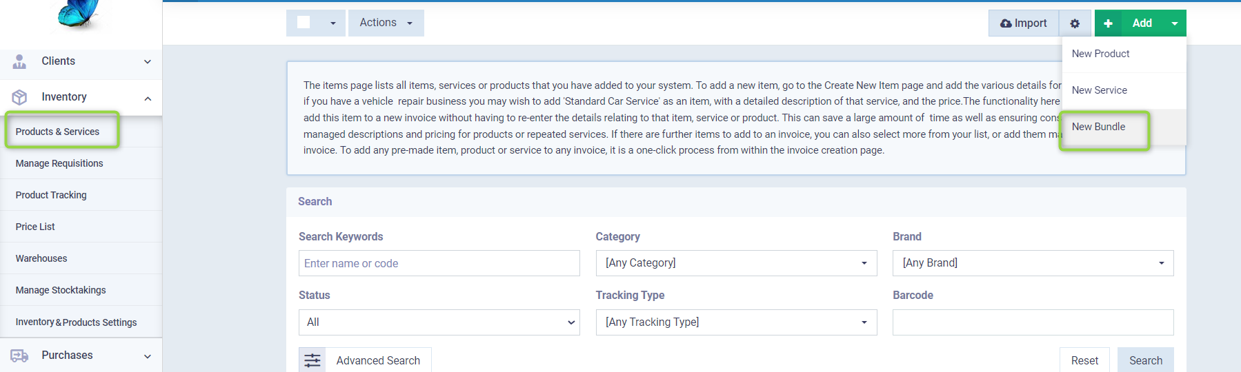Click on “Products & Services” in the dropdown menu under “Inventory” in the main menu, then click on the “Add” button and choose “New Bundle”.