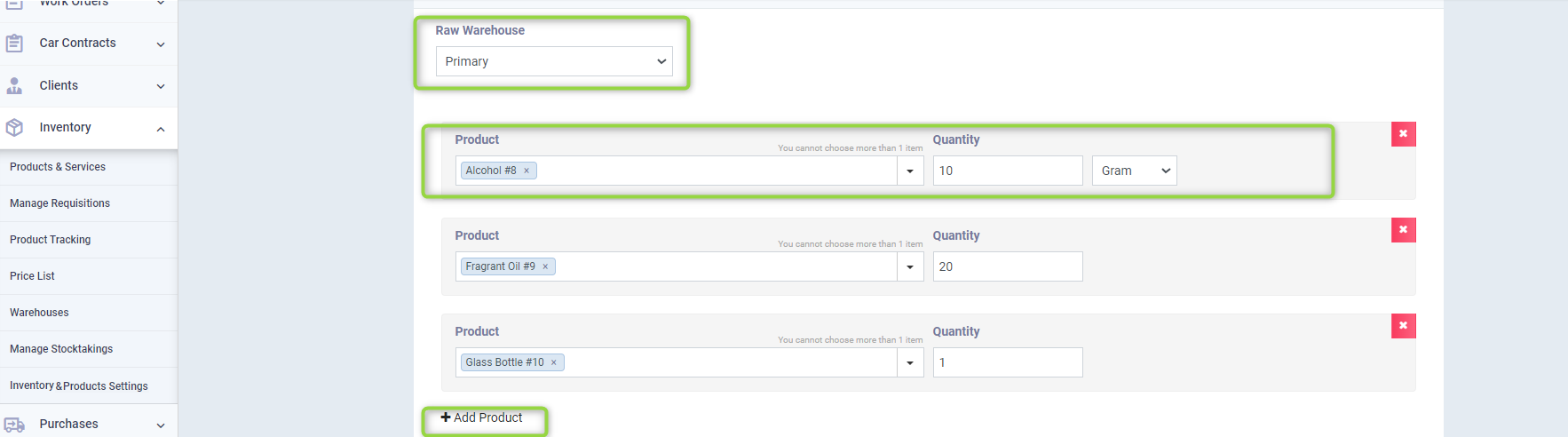 Products: Enter all the raw material items and their quantities required to form the bundled product.