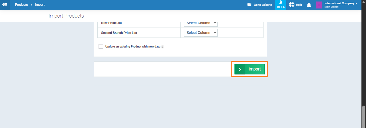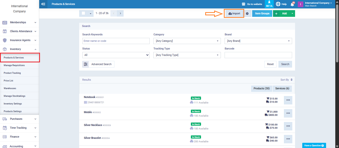 From the main menu, click “Products & Services”, then click the “Import” button.