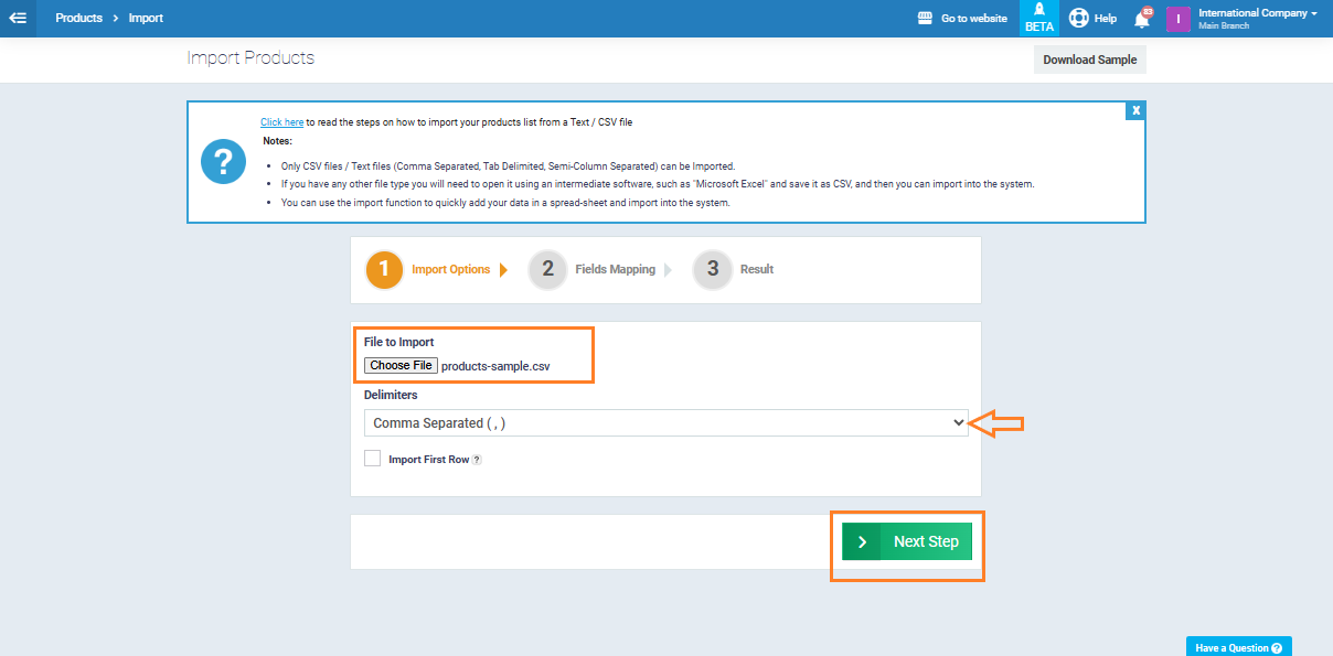 Select the required file by clicking “Choose File”, then choose the “Comma Separated” option as the delimiter, and click “Next Step” to proceed.