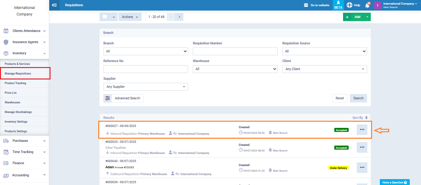 If you want to delete the quantities added through the uploaded file, or even remove the products entirely, go to “Manage Requisitions”, then select the requisition automatically created by the system for the imported product quantities from the Excel file.