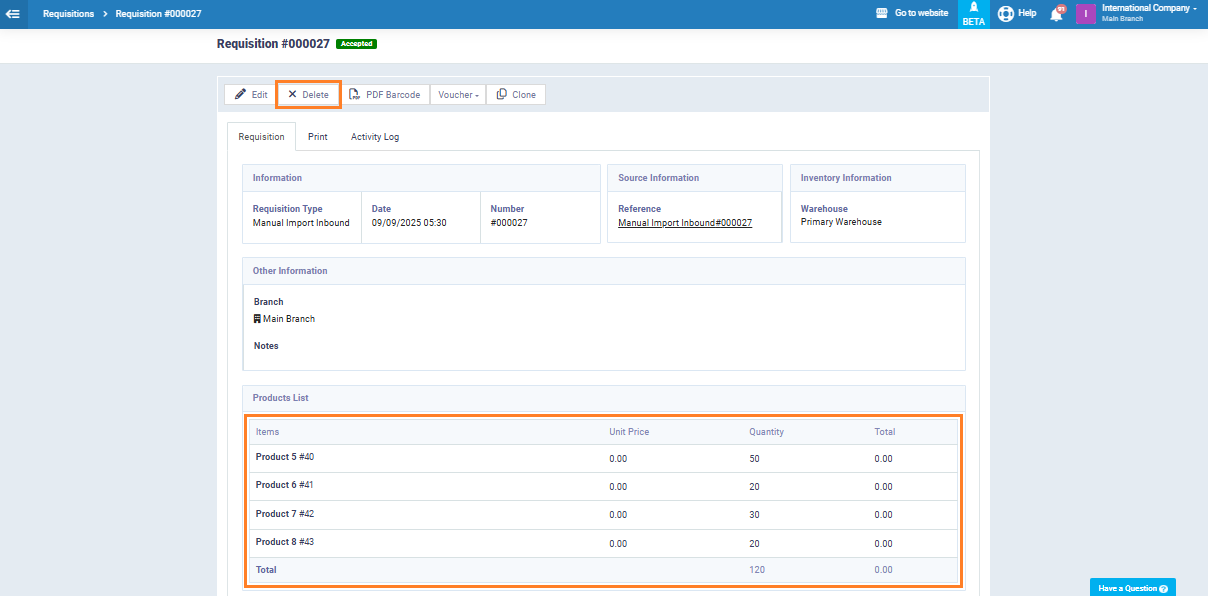 Now, delete the requisition by clicking the “Delete” button. This will permanently remove the recorded quantities or the products that were added through the file from the system.