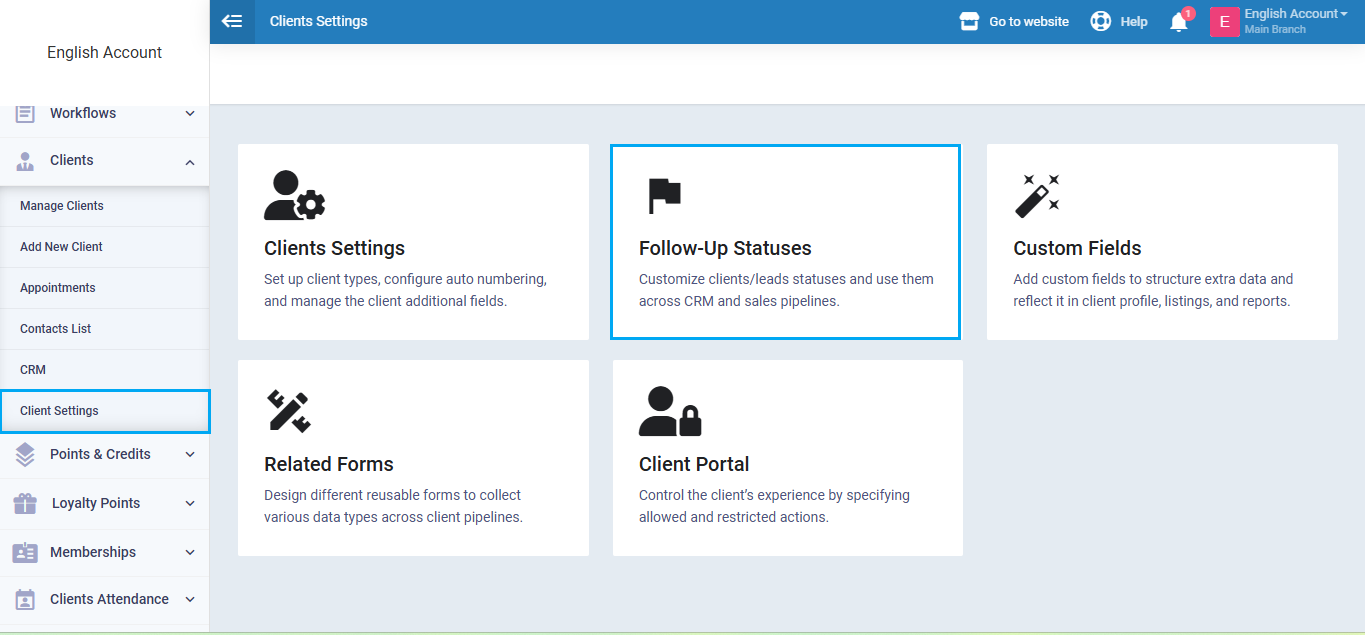 Click on “Client Settings” found under “Clients” in the main menu, then click on the card labeled “Follow-Up Statuses”.