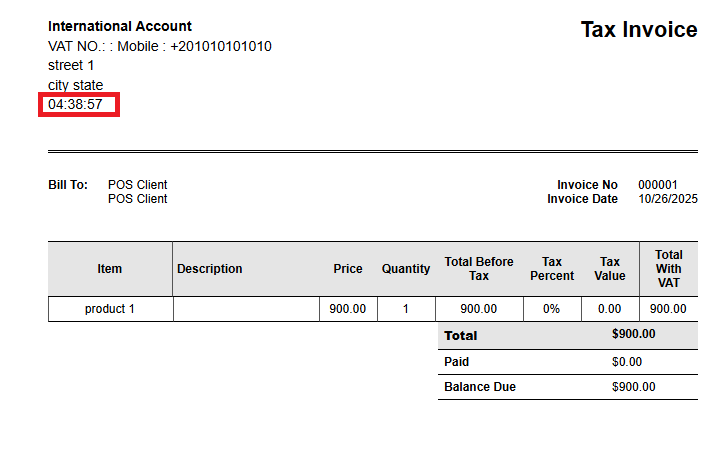 In addition to the default invoice layout, the system provides several other layouts that you can use as they are or customize by adding or removing fields or changing the design. In this article, we will review how to control the display of the invoice creation time and print time in the print layout.