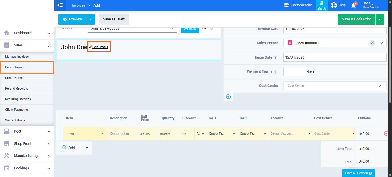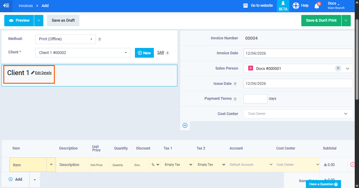 Many times, we need to edit client details like “Client Name,” and we want to issue invoices with the updated client name. To make these changes easily, you can do it from the invoice creation page instead of going to the client page and then returning to the invoice page.