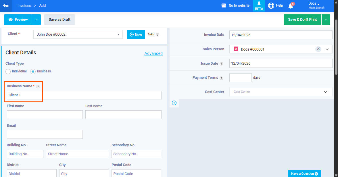 - After saving, the client will appear with the updated name, and you can proceed to save the invoice with the new changes.