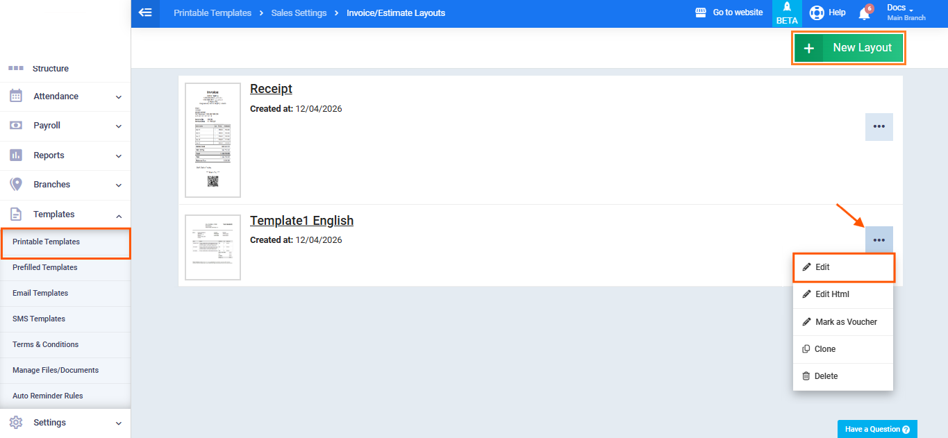 - Click on “Edit” to modify an existing design or “New Layout” to create a new one.