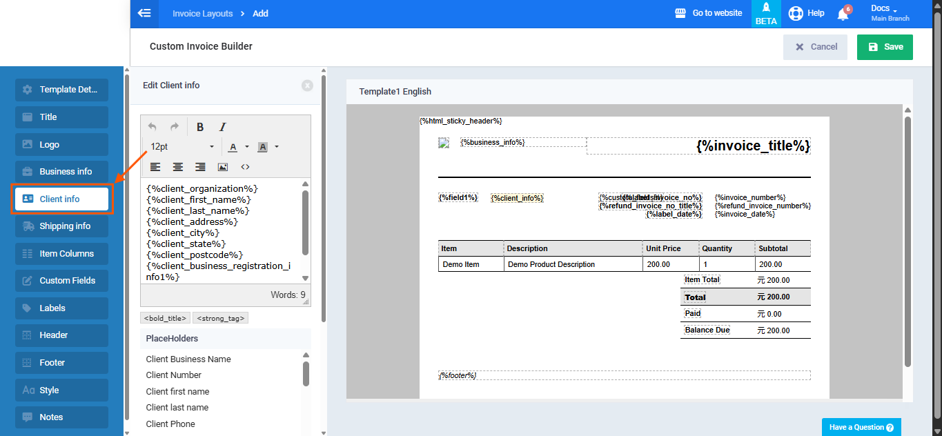 - Client Tax ID: Use the variable “{%client_bn2%}” to add the client’s tax ID dynamically with each new invoice.