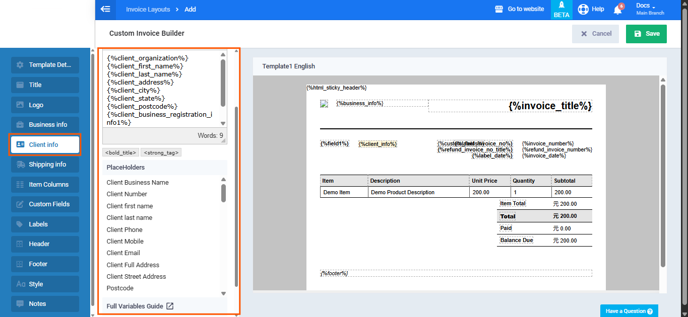 - Client Business: Use the variable “{%client_business_name%}” to add the client’s business name dynamically with each new invoice.