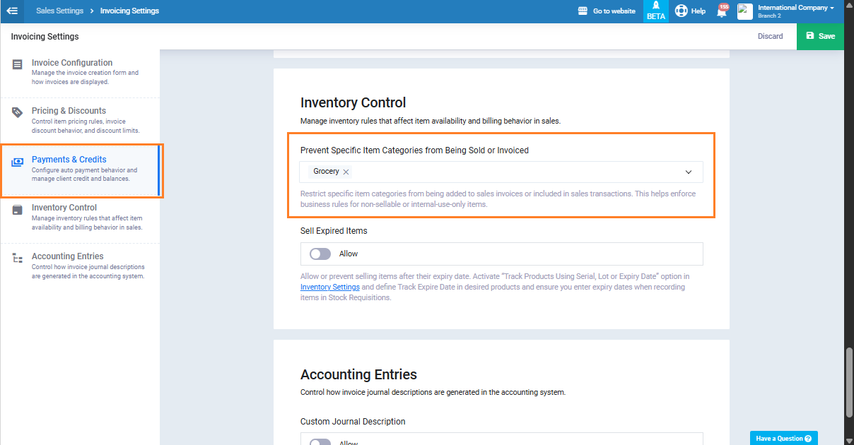 Click on “Sales Settings” from the dropdown menu under “Sales” in the main menu, then click on “Invoicing Settings“, scroll down to “Inventory Control” section. Choose the category you want to exclude from this branch by selecting it from the dropdown menu under “Prevent Specific Item Categories from Being Sold or Invoiced” and click the “Save” button.